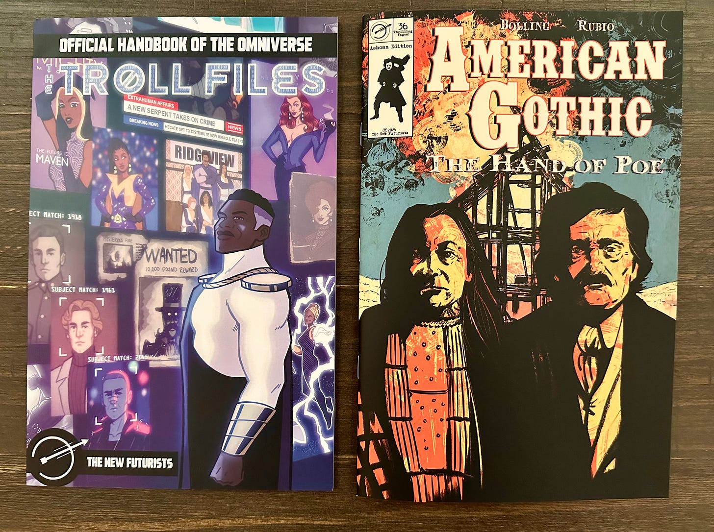 Yes. The rumors are true. We have a limited number of print editions collecting the first series of Omniverse trading cards as the Official Handbook of the Omniverse Volume One: Troll Files and the first three chapters of American Gothic: The Hand of Poe as an ashcan edition! We haven’t added these collections to our online store just yet, but stay tuned as we plan to make those available to everyone early this fall.
